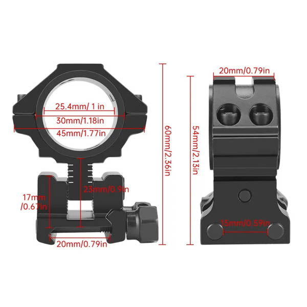 The adjustable height design of scope rings allows the sh00ter to find the most suitable and comfortable height of scope, position the center of the riflescope tube at a height of 32mm(1.26") to 38mm(1.5") from the base, fits 1 inch and 30mm tube optics